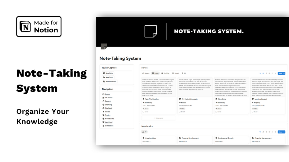 Notion Note-Taking System transforms scattered information into organized, actionable knowledge. This template is ideal for professionals, students, and knowledge workers who want to capture ideas, process information systematically, and build a connected knowledge base that grows more valuable over time.